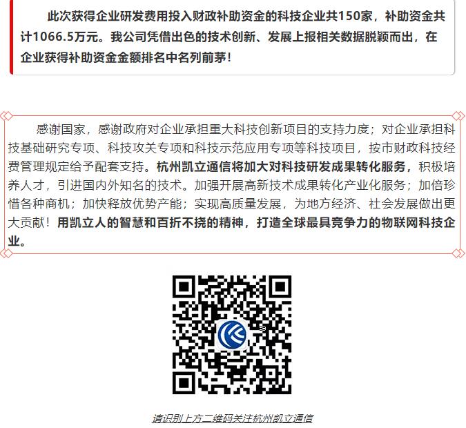 喜報|杭州凱立通信榮獲杭州市科技發(fā)展專項資金